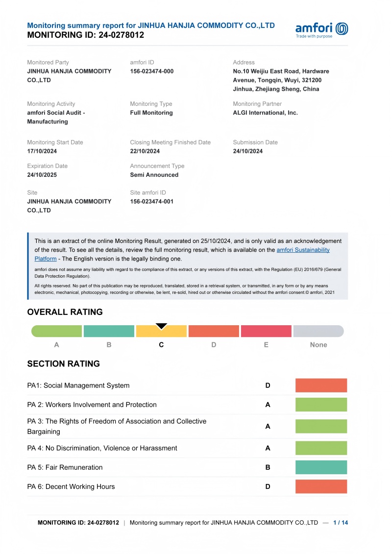 در ژوئیه 2025 ،شرکت کالاهای Jinhua Hanjia ، Ltd.با موفقیت مجوز سطح C را در برنامه بین المللی طبقه بندی استاندارد (ICS) برنامه حسابرسی کارخانه ، که توسط آژانس بازرسی اروپایی شخص ثالث منصوب شده توسط اتحادیه تعاونی Enseigne انجام شده است ، به دست آورد. این سیستم صدور گواهینامه شامل چهار ردیف است: A ، B ، C و D. به عنوان عضو اتاق بازرگانی و صنعت فرانسه (FCD) ، این شرکت به طرح مدیریت اجتماعی سازمان بین المللی کار استاندارد SA8000 ، اجرای ممیزی های مسئولیت اجتماعی بر روی تأمین کنندگان خود پیروی می کند. دامنه حسابرسی شامل حوزه های حسابرسی از جمله حقوق بشر ، بهداشت و ایمنی ، شرایط مالی ، شرایط مالی ، شرایط مالی ، دستاوردها و شکایت است.